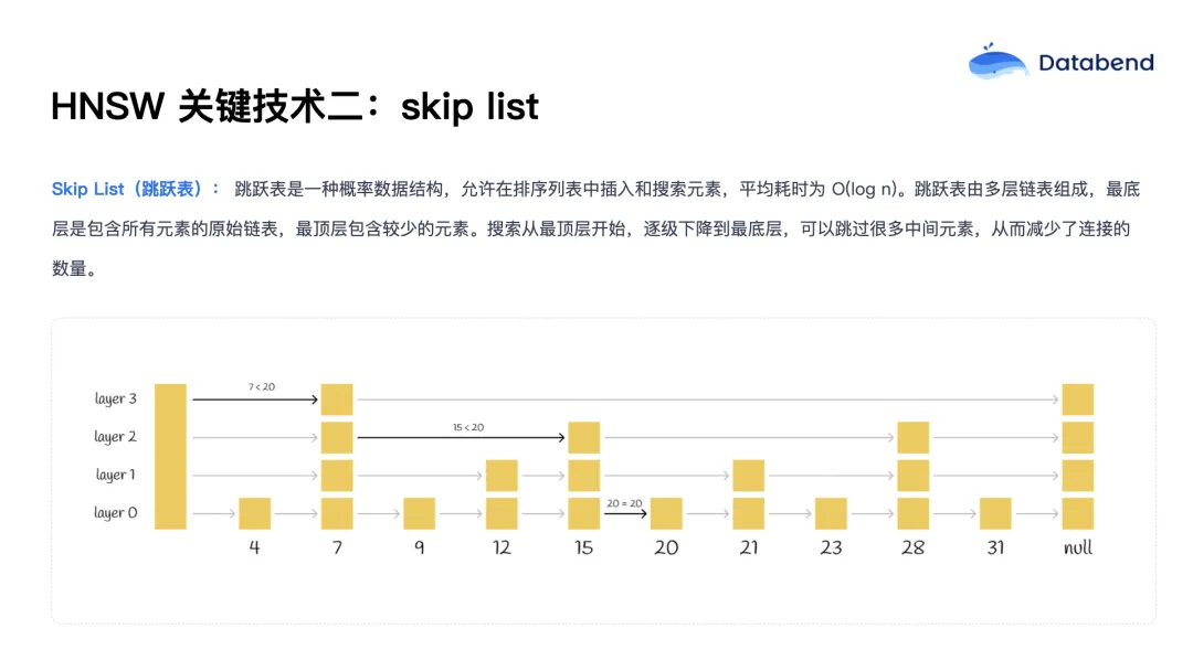 第二项技术是跳表(Skip List) ,引入了分层结构。最底层包含所有原始数据,越往上每层包含的数据越少,最顶层仅有极少数抽样节点。检索时,从顶层开始,逐层向下缩小范围,大幅减少搜索路径。比如在查找 20 这个数时,从第三层仅需遍历 3 个节点,而若从最底层遍历则要经过 6 个节点,分层结构显著提升了检索效率。