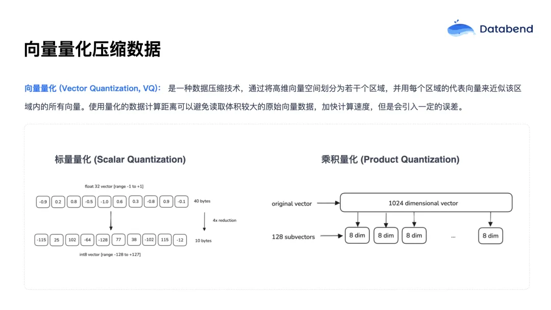 为了将这些非结构化数据转化为计算机可处理的形式,通常需要使用大模型对数据进行处理,将其转换为数字化的向量。这些向量能够捕捉原始数据的各个维度信息,为后续分析和应用奠定基础。然而,传统数据库主要针对结构化数据设计,对于向量数据的处理能力有限,无法高效地存储和索引。为满足新需求,越来越多的数据库开始支持向量数据,并通过索引技术加速相关查询。Databend 同样支持向量数据,能够实现高性能的检索。