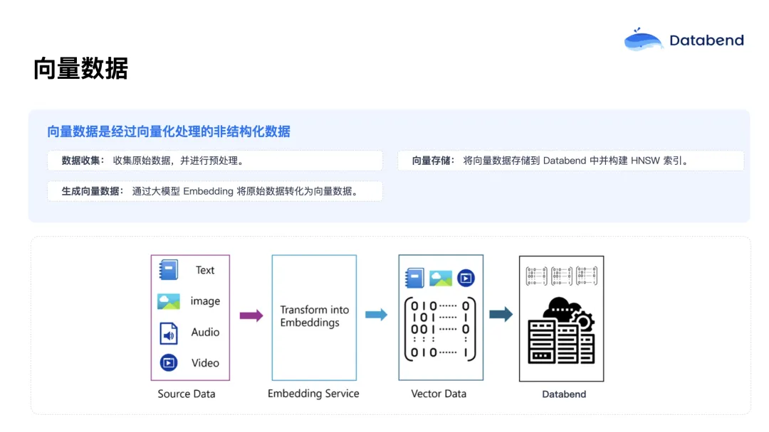 Databend 作为一款云原生的 OLAP 数据库,也在积极拥抱向量数据。本文重点介绍 Databend 最近开发的向量数据类型和向量分析技术,帮助用户深入了解 Databend 在向量数据处理方面的能力。