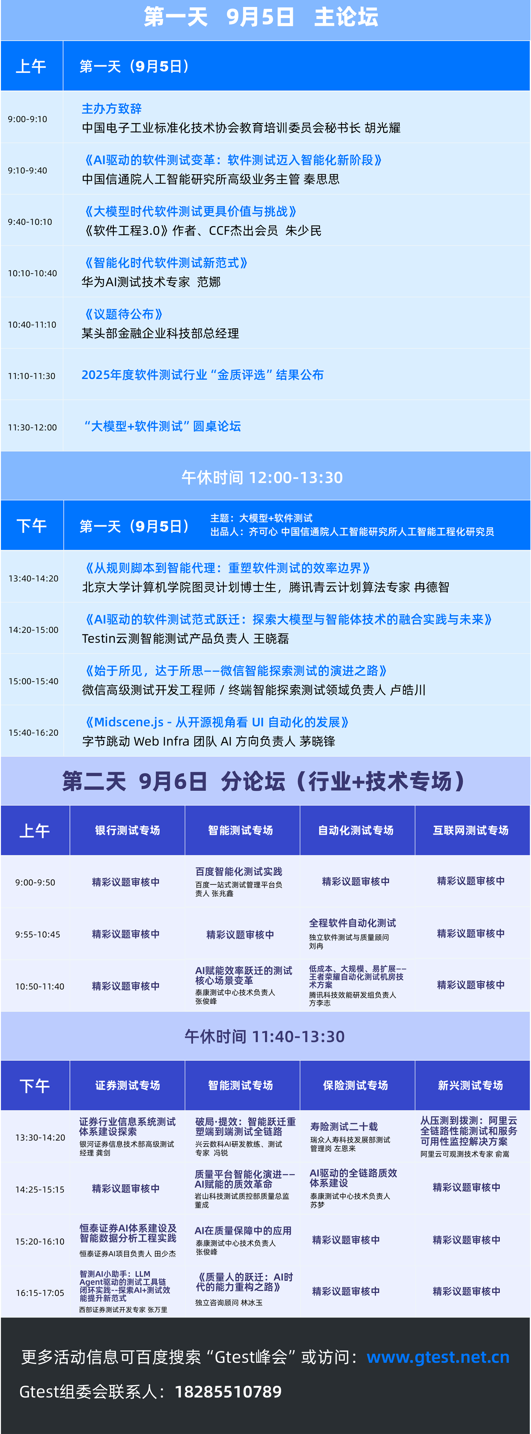 为促进测试技术与行业应用的深度交流,2025年9月5日-9月6日,“全球软件测试技术峰会”(简称:Gtest)将在北京市丽亭华苑酒店举办。本届峰会将聚集超500位来自测试、质量、大模型、开源测试工具等领域的行业专家、技术负责人及一线工程师,构建多元化交流与合作平台。