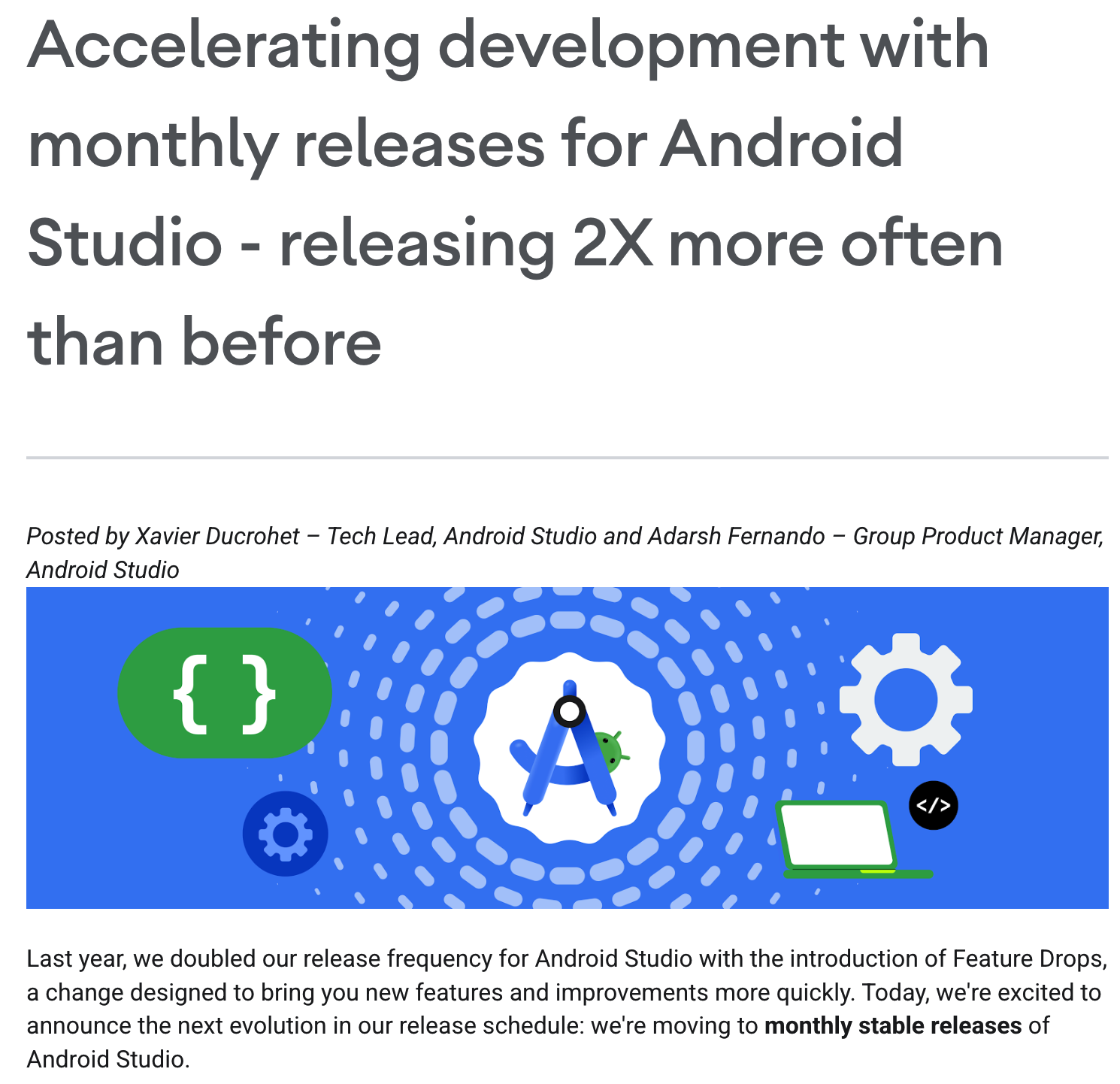 谷歌官方宣布,Android Studio 的更新节奏将全面提速,从即日起实行每月发布一次稳定版的策略。