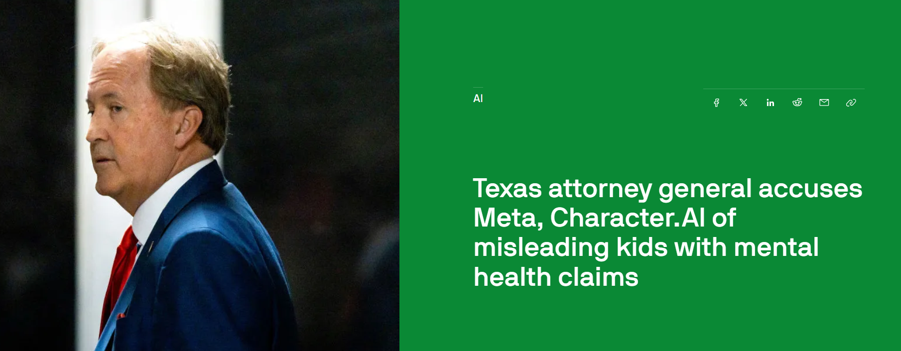 得克萨斯州总检察长肯・帕克斯顿已于周一发布新闻稿,宣布对 Meta 人工智能工作室(Meta AI Studio)和 Character.AI 展开调查,理由是这两家公司 “可能存在欺骗性贸易行为,并将自身误导性地宣传为心理健康工具”。