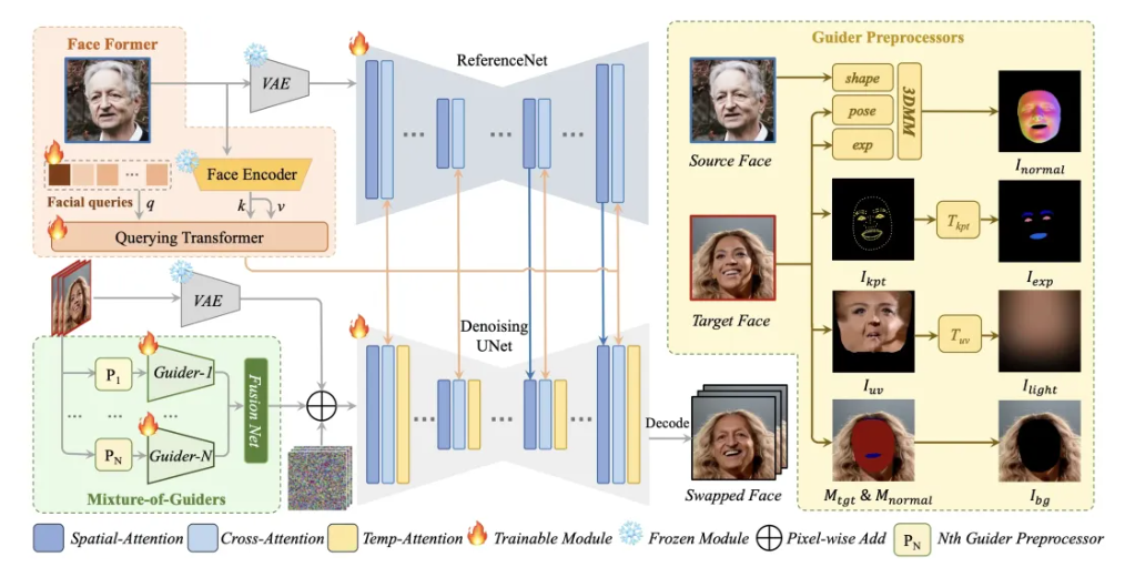 具体而言,利用源图像提取身份形状参数 α,目标视频逐帧提取姿态 β 与表情 θ,随后渲染生成形状–姿态法线图,减少目标人脸身份泄露,最大程度保留源身份;表情信息仅保留眉毛、眼球及口唇区域的运动先验,避免引入目标身份特征;光照条件由 UV 纹理图经模糊处理得到,仅保留低频光照分量;背景条件采用遮挡感知掩码与随机位移策略,实现训练–推理阶段的目标脸型对齐。四条条件并行输入 Mixture-of-Guiders,每组由3×3 卷积与零卷积末端构成,在注入网络前经过 FusionNet 融合四条条件的特征后注入到扩散模型中,可在保持 Stable Diffusion 预训练先验的同时实现精准控制。