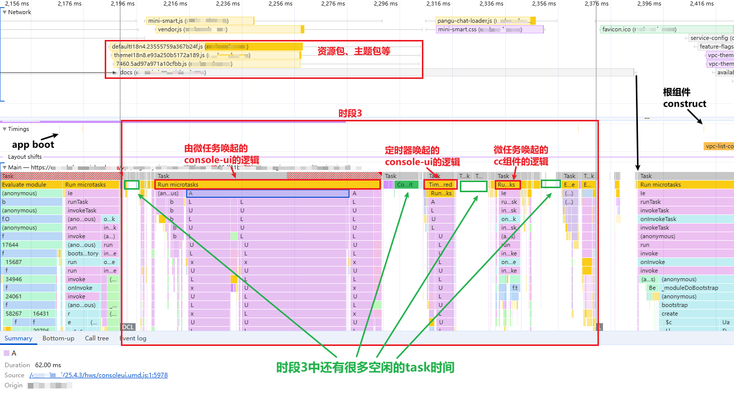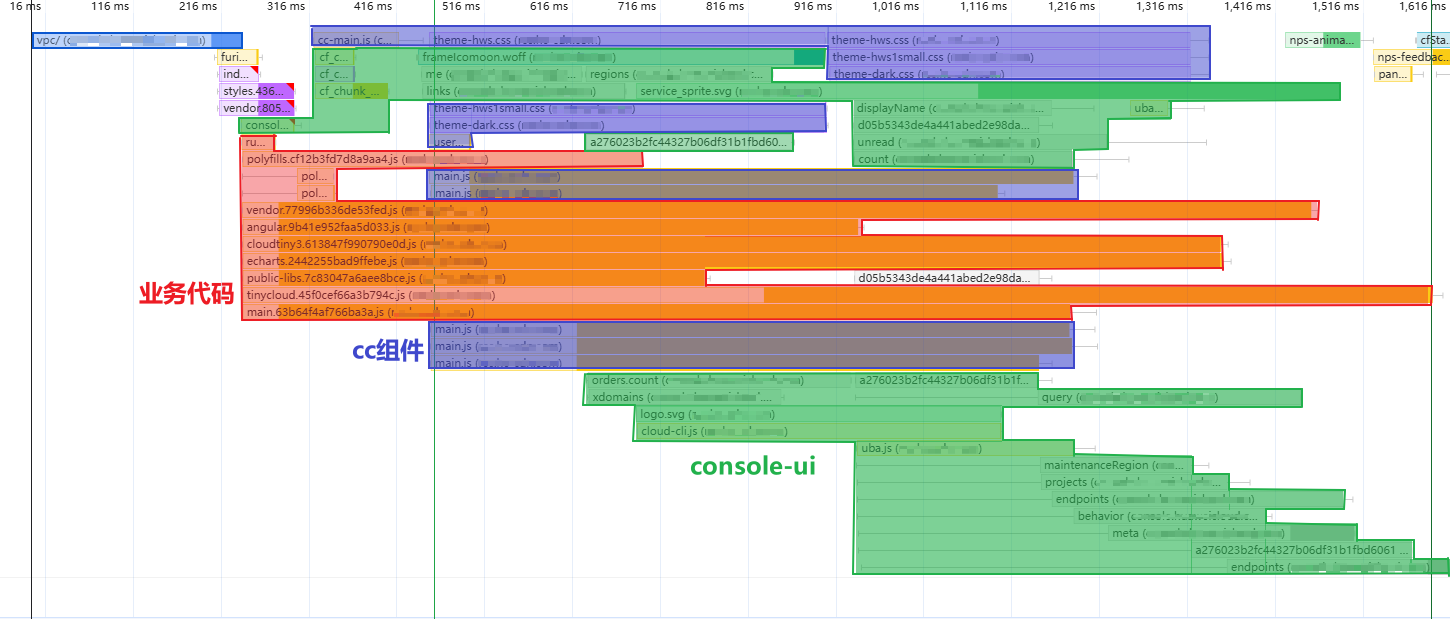 时段小结: 这一时段主要是完成各种HTTP请求,主要有 业务代码、console-ui、cc组件三方参与。首轮请求主要是业务代码的请求,采用h2协议,console-ui及cc组件则多为非首轮请求。