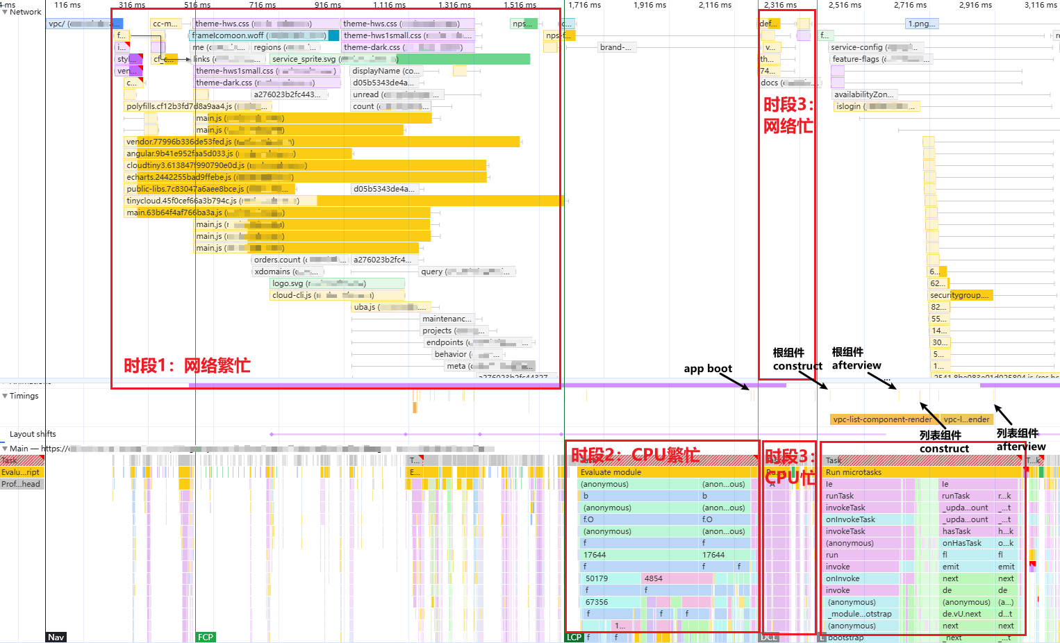 从Timings面板中可知,在时段3之后、特别是根组件construct之后,根组件afterViewInit、列表组件的construct和afterViewInit都紧锣密鼓的执行起来了。这一段CPU极其繁忙,按生命周期顺序执行各个组件的初始化,直到列表组件的afterViewInit完成后,列表页主内容区域才展示出来。