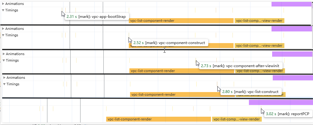 例如,针对VPC列表页的主渲染流程,我们在 NG App启动、根组件constructor及ngAfterViewInit、列表页组件constructor及ngAfterViewInit,分别加上performance.mark,则能在Timings面板中看到下图情况: