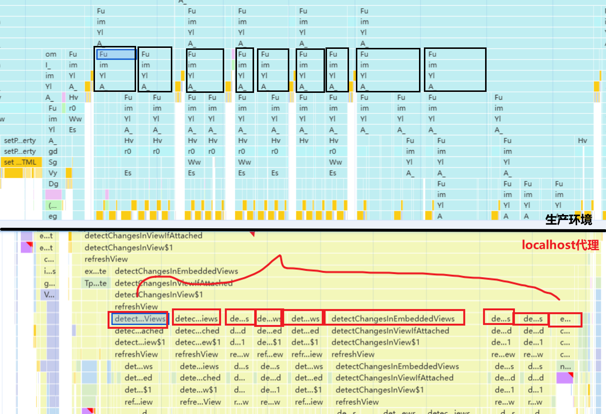 可以看出有一段结构很相似的调用,出现了多次重复。从localhost环境抓取的性能图中就可以明显看出,这段重复执行的是 detectChangesInEmbeddedViews 函数,它是angular的内部函数。在嵌入式视图场景中,如果有大量ngFor、ngIf就会触发。通过源码分析,这一段正是导航组件中的代码实现造成的。