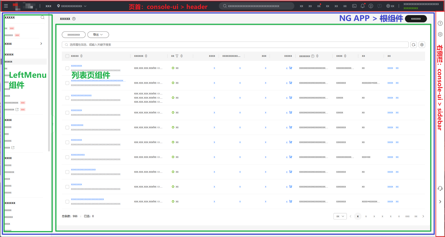 - 红色框:由基础框架console-ui提供的header、sidebar 实现