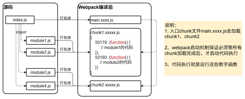 这里需要对webpack打包产物有一定了解,才能透彻了解这个过程,简要说明如下: