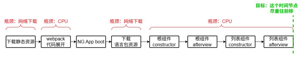 通过上一节中对性能图透彻分析之后,我们已经能将性能图跟源码对应起来,并且能将性能图跟加载流程对应起来,同时对一些关键节点心中有数。接下来要做的就是找问题、找可优化的空间,以达到我们的目标。例如针对VPC列表页的分析可知,主渲染流程在性能图中大致是: