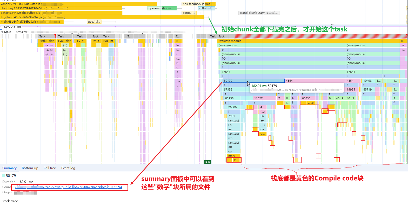 - 查看色块在做什么:查看这个task的火焰图的栈底,会发现全是黄色的Compile code块,说明在编译代码(V8引擎的惰性编译策略)