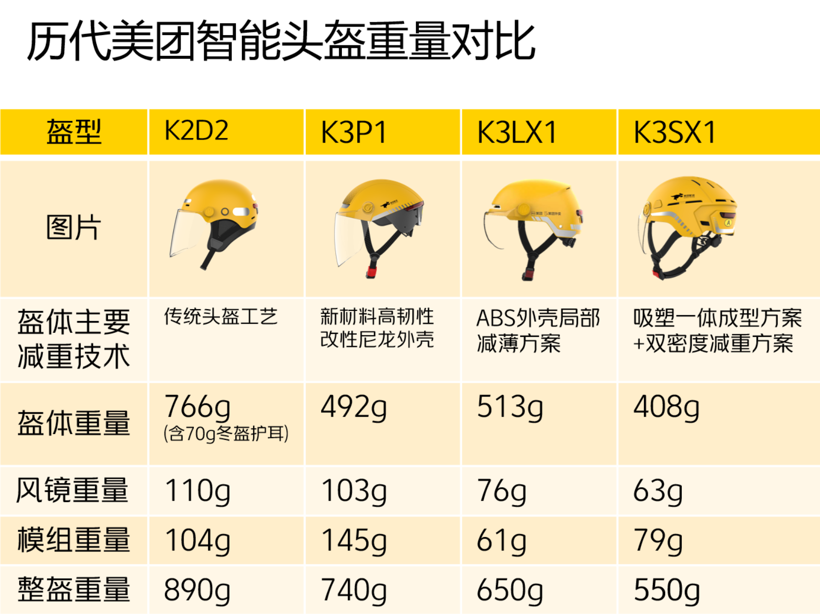 对于外卖骑手而言,头盔减重技术绝非简单的数字游戏,而是关乎职业体验的关键革新。700g左右的传统头盔如同 "铁帽" 般压在头顶,每骑行一小时就可能累积近半公斤的垂直压力,导致颈椎劳损与疲劳感加剧。美团智能头盔通过「材料基因 + 工艺重构 + 系统集成」的三重减重革命,将整机重量降至550g,在摩托车头盔国标框架内实现「安全不减重」的技术突破。