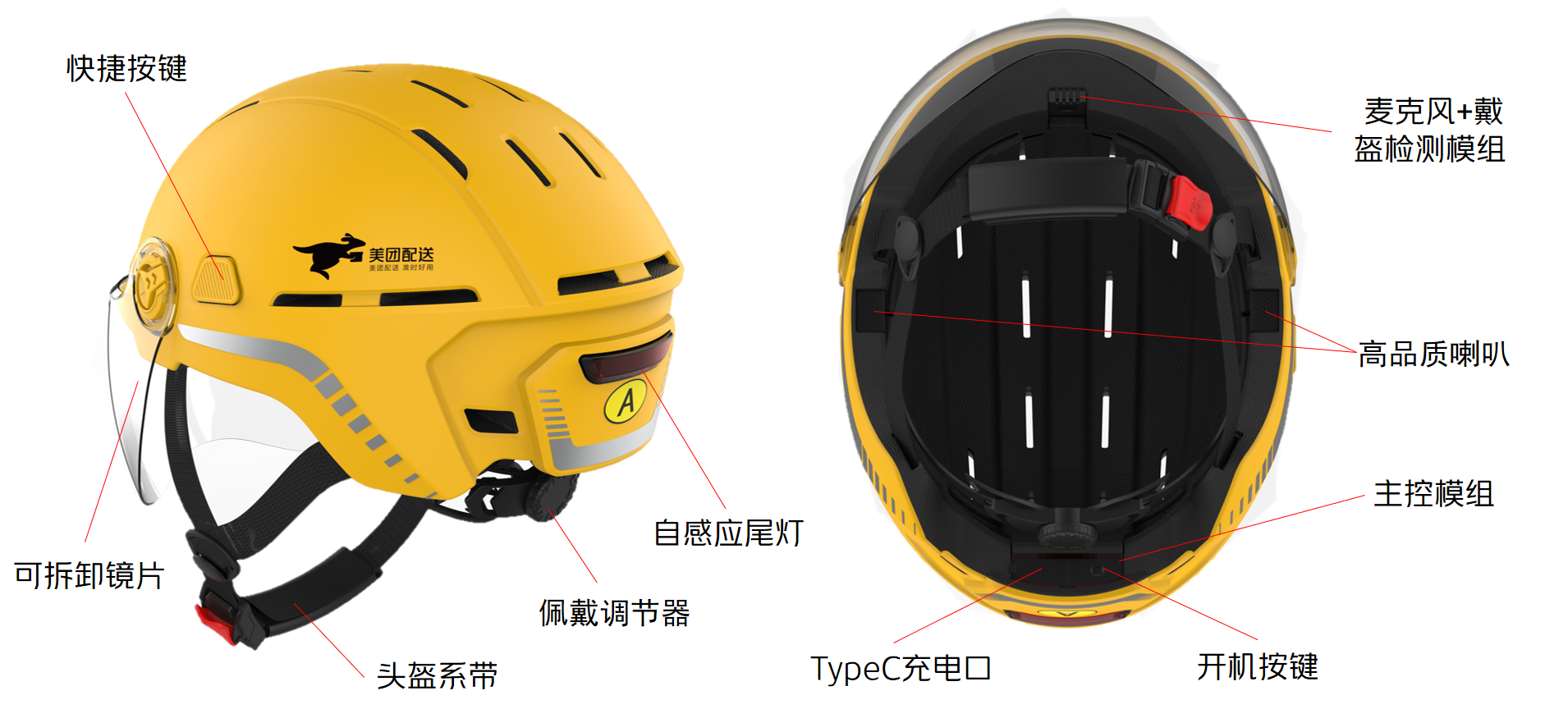 美团智能头盔作为专为外卖骑手打造的智能安全装备,在传统头盔基础上,增加了喇叭、麦克风、快捷按键、尾灯等硬件模组,具备蓝牙耳机/语音助手功能,实现智能语音交互、实时感知戴盔、碰撞和摔倒等功能。