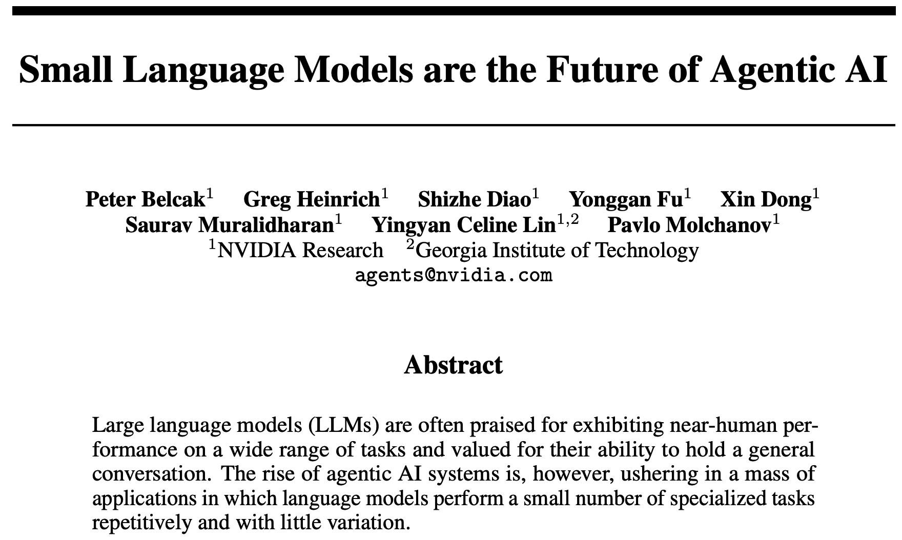 英伟达与佐治亚理工学院研究人员联合发布《Small Language Models are the Future of Agentic AI》论文,提出了一个极具颠覆性的观点:SLM(小型语言模型)才是智能代理(Agentic AI)的未来。