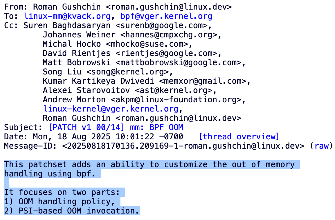 Linux 内核正迎来一项可能改变内存管理方式的新提案。来自谷歌的内存管理专家 Roman Gushchin 提交了一组补丁,计划允许通过 BPF(eBPF)直接定制系统在 内存溢出(OOM, Out-of-Memory) 时的处理逻辑。这意味着,长期以来依赖内核默认 OOM killer 或用户空间工具(如 systemd-oomd)的局限性,或将被更灵活、可编程的机制取代。