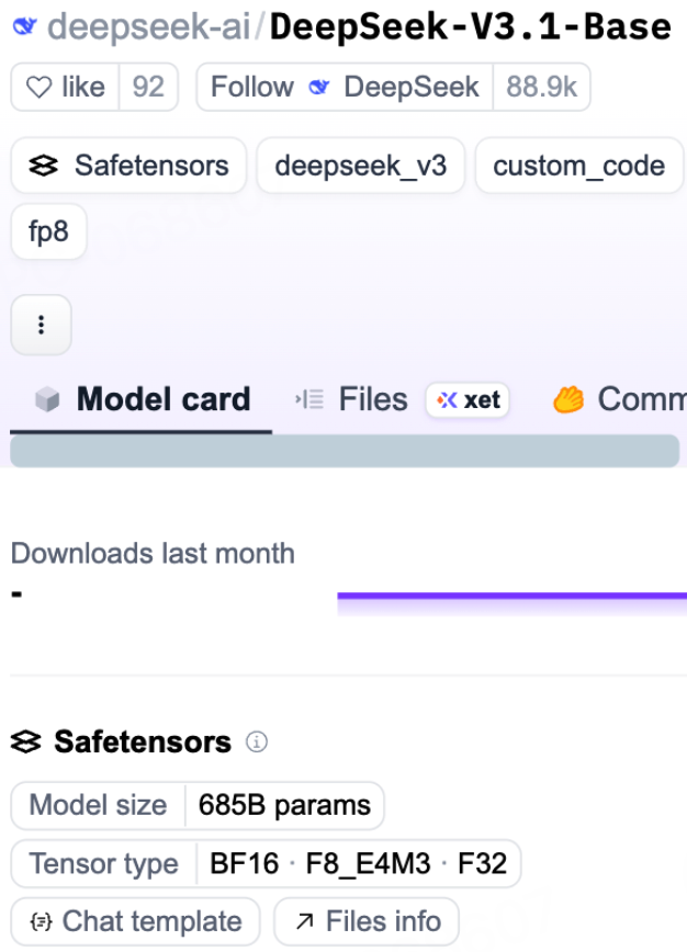 DeepSeek 最新开源模型 V3.1-Base 已上架 HuggingFace,相关信息如下: