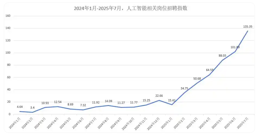 数据显示,2025年7月,脉脉平台上人工智能新发岗位量相较2024年1月暴涨29倍,同比增长10倍。目前已有超过1000家人工智能企业在平台招聘人才,相关在招岗位数量超过7.2万个。