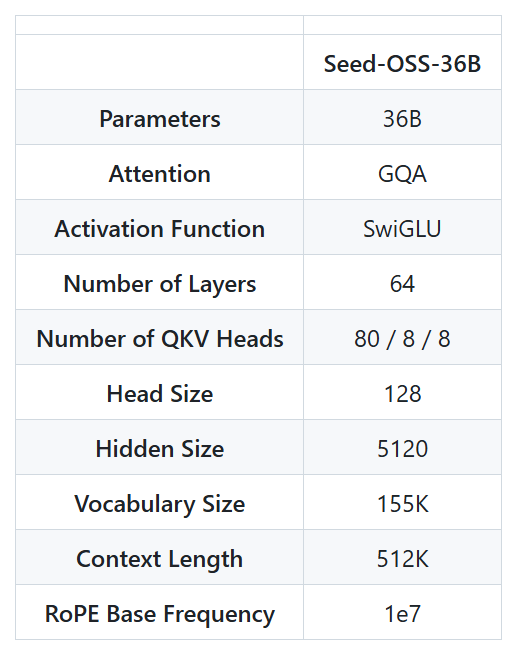 Seed-OSS 系列模型基于流行的因果语言模型架构,采用了 RoPE、GQA 注意力机制、RMSNorm 和 SwiGLU 激活函数。最新发布的 Seed-OSS-36B 模型拥有360亿个参数,具备512K 的长上下文处理能力。尽管该模型仅使用了12万亿个训练数据,其在多个流行的基准测试中表现出色。