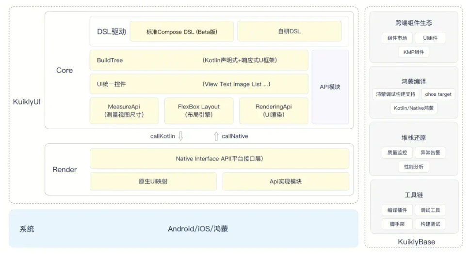 简单回归一下Kuikly的整体架构,跨端Core层处理框架核心逻辑,Render层负责不同平台渲染。新平台接入Kuikly需要实现自己的Render层。