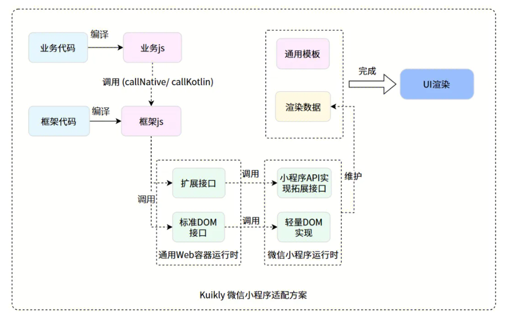 借鉴了业界主流小程序框架Tarojs和Kbone的思路,结合Kuikly框架的特点,通过实现Web容器运行时接口,提供轻量级DOM和拓展接口实现,仅实现Kuikly需要的能力,并做了一系列针对Kuikly渲染流程的优化。如下图:
