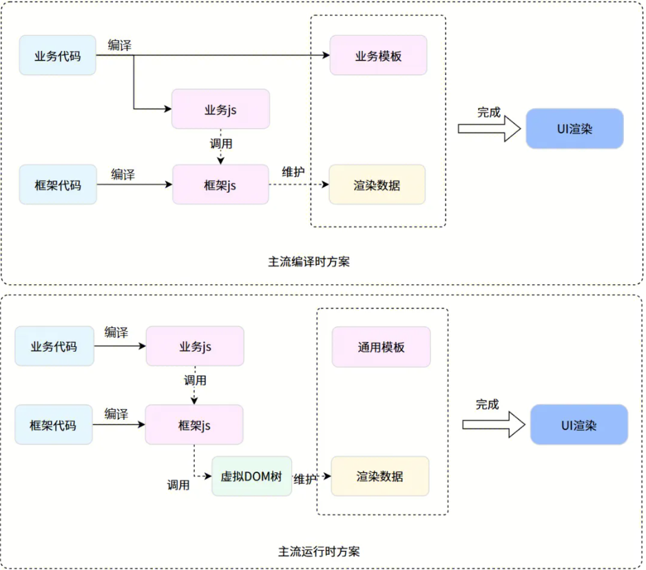 项目团队在适配微信小程序之前,调研了目前支持微信小程序的跨端框架。这些框架基本都是基于前端技术,在微信小程序上基本采用编译时或者运行时方案,最终都是数据驱动模板完成UI渲染。如下图: