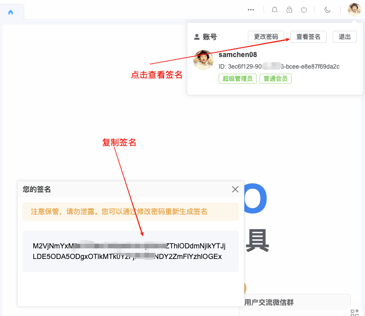 - 登录后,点击右上角用户信息卡片中的"查看签名"按钮
