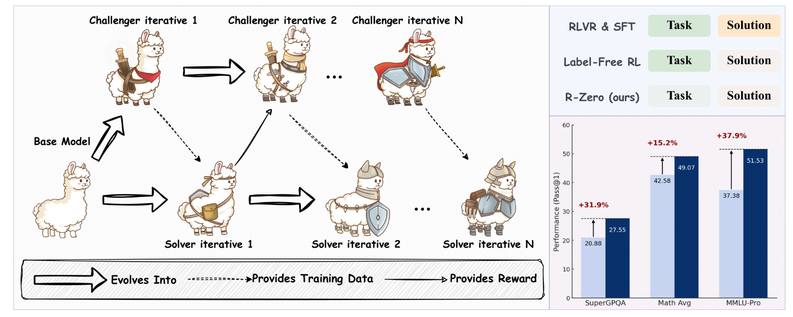 R-Zero 是一个新颖的框架,它使 LLM 能够自主提升其推理能力,而无需任何预先存在的任务或标签。它是一个真正自我进化的系统,可以从零开始学习。
