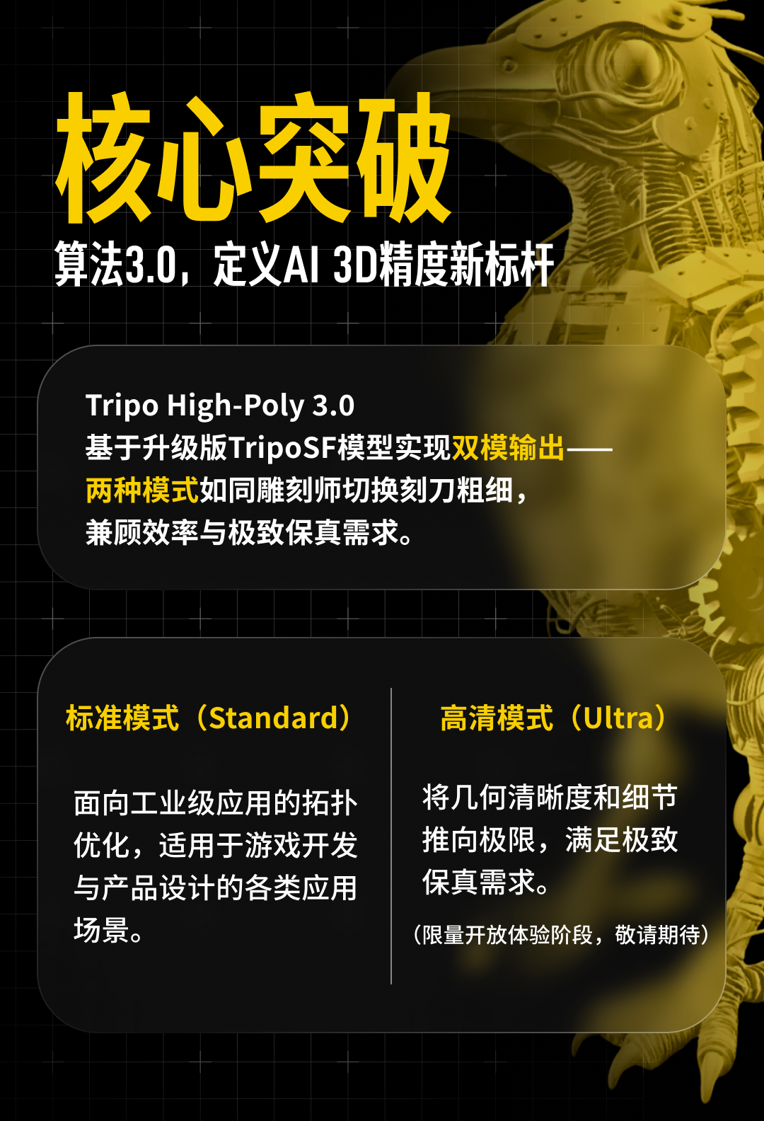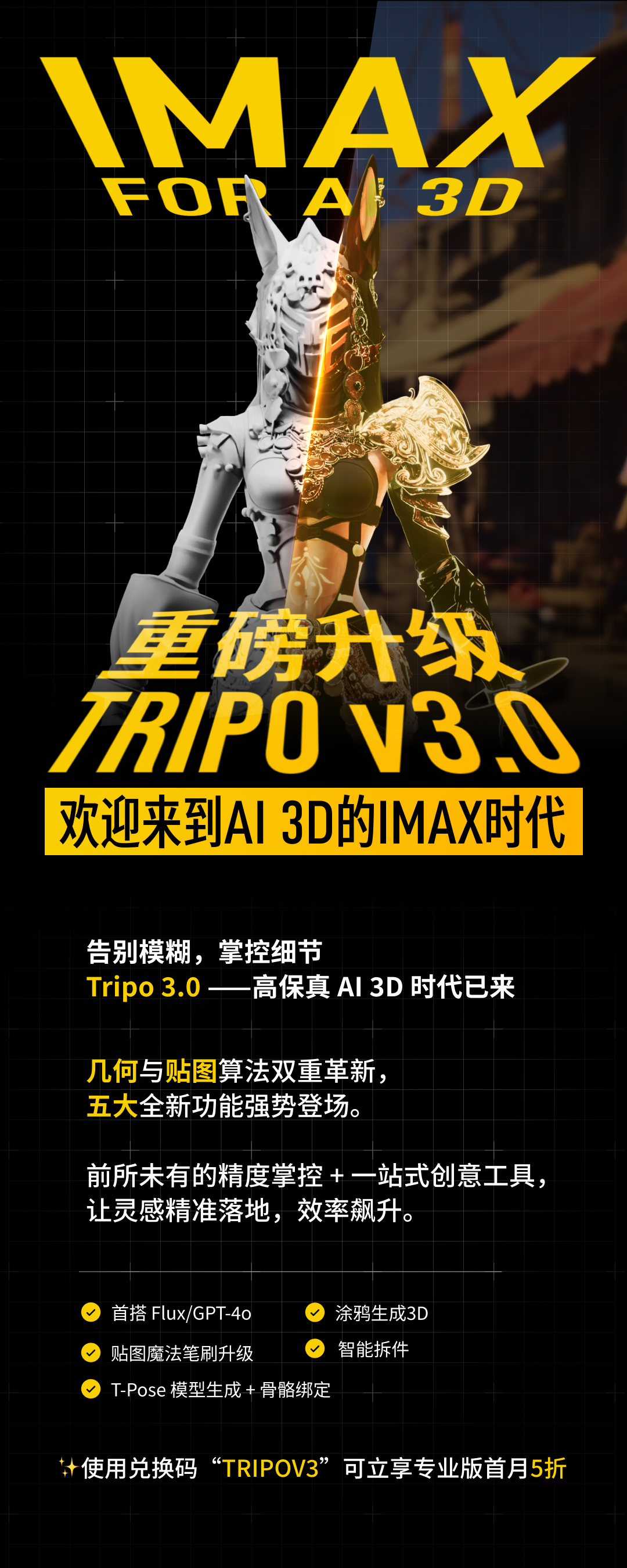 近日,VAST 宣布 Tripo 3.0 重磅升级,并宣称“欢迎来到 AI 3D 的 IMAX 时代”。
