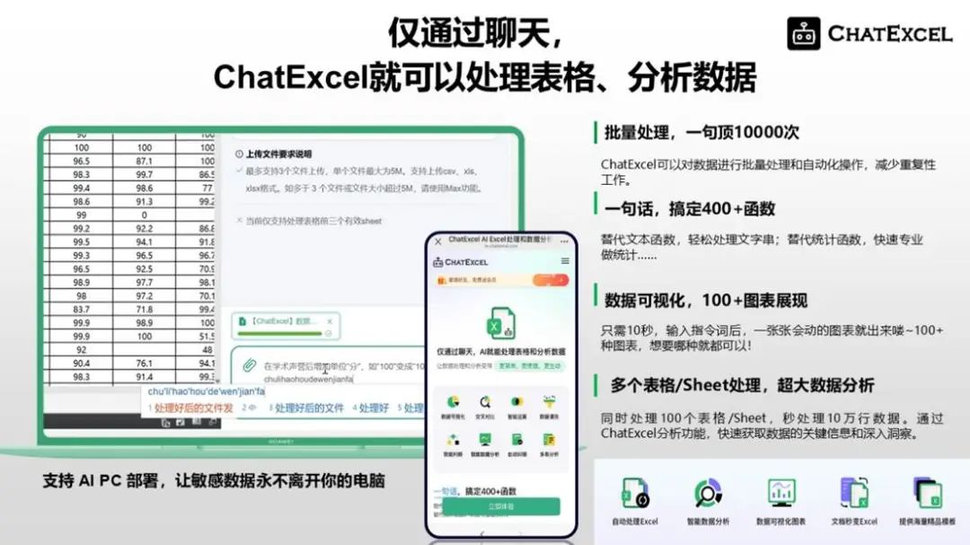ChatExcel是由北京大学团队创立的AI Native数据智能体企业,开发出全球首款适配AIPC级端侧部署的数据垂直模型。其核心产品通过对话式交互实现Excel处理和数据分析,有效降低数据使用门槛。