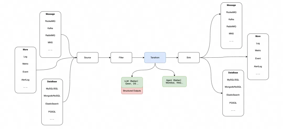 在这一技术变革的浪潮中,数据处理能力的重要性愈发凸显。传统的数据处理架构主要围绕结构化数据的批量处理而设计,采用的是相对静态的 ETL 模式。然而,AI 时代的数据处理需求呈现出截然不同的特征:数据源更加多样化 ,包括文本、图像、音频、视频等多模态数据;处理要求更加实时化 ,需要支持流式数据的即时处理和响应;应用场景更加智能化,需要结合大语言模型的推理能力进行数据的理解、转换和增强。