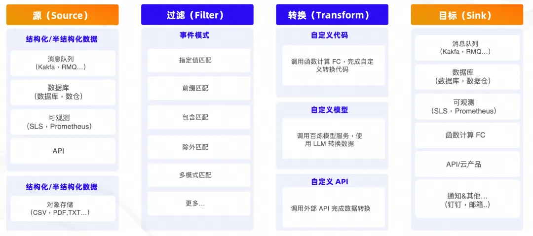 源(Source)能力负责事件的接入和采集。EventBridge 支持多种类型的事件源,包括结构化数据源和非结构化数据源。结构化数据源涵盖了消息队列(Kafka、RocketMQ 等)、数据库(关系型数据库、数据仓库)、可观测性平台(SLS、Prometheus)、API 接口等。非结构化数据源则包括对象存储(CSV、PDF、TXT 等文件格式)以及各种自定义数据源。这种多样化的数据源支持使得 EventBridge 能够适应 AI 应用中复杂多变的数据接入需求。