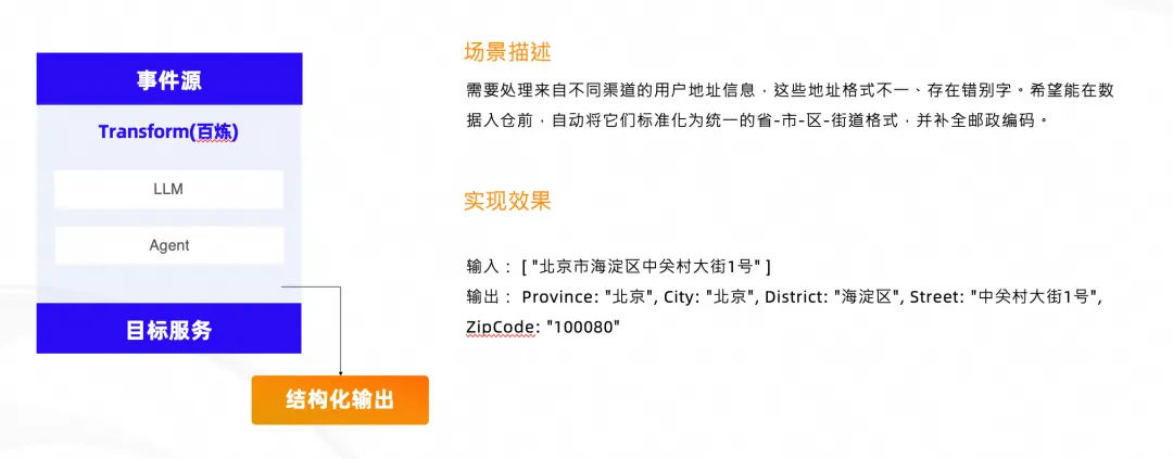 地址信息的标准化是一个典型的数据清洗场景。在实际应用中,来自不同渠道的地址信息往往格式不一、存在错别字、缺少关键信息等问题。EventBridge 通过 LLM 驱动的地址标准化能力,能够将各种格式的地址信息转换为统一的标准格式。
