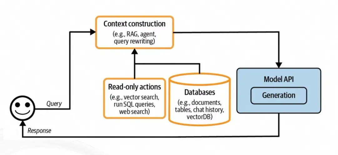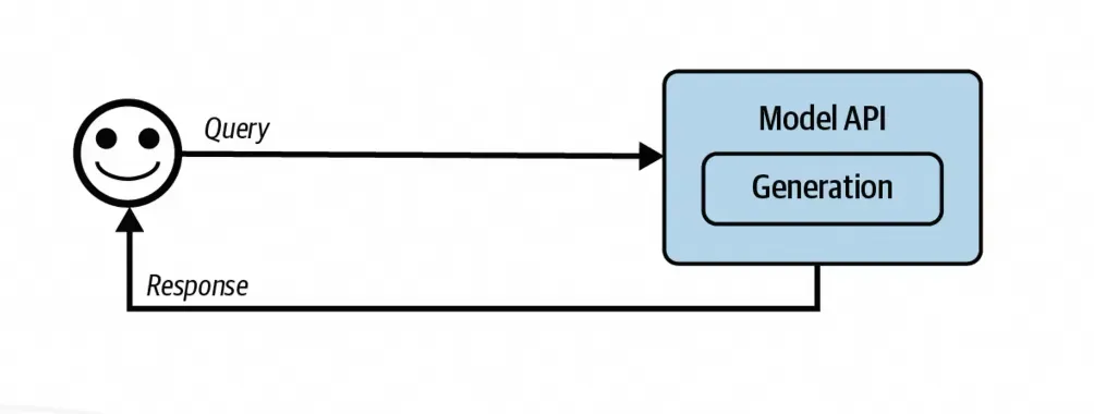 在生成式 AI 发展的初期阶段,应用架构相对简单直接。用户通过 Query 向大语言模型发送请求,模型基于预训练的知识生成 Response 并返回给用户。这种架构虽然现在看来可能过于"简陋",但却是许多初期现象级 AI 应用产品的起点,如文本总结、AI 算命、AI 情感分析等应用都采用了这种直白的架构模式。