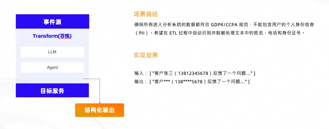 数据脱敏是保护隐私的重要技术手段,EventBridge 可借助大模型,实现隐私信息识别,隐私信息处理等多种数据脱敏处理场景。为用户提供端到端的数据处理能力。