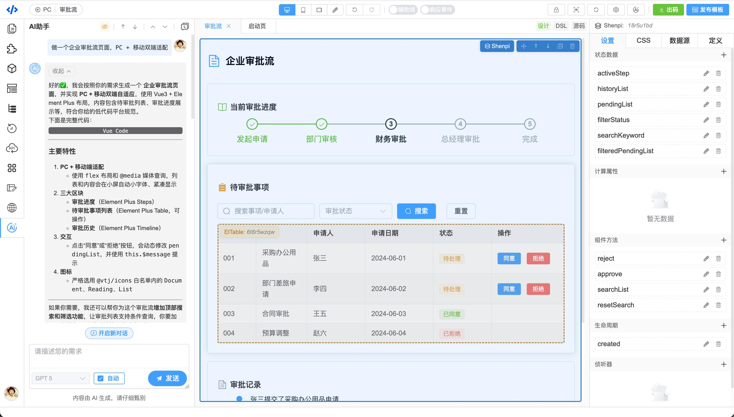 - 从“手动拼装”到“意图理解”: 过去需一个个“搭”出页面,现在只需说“我要一个报销功能”,AI就能从表单到流程一并生成。更重要的是,AI会“理解你没说出口的东西”,而传统低代码只懂你点到哪儿。