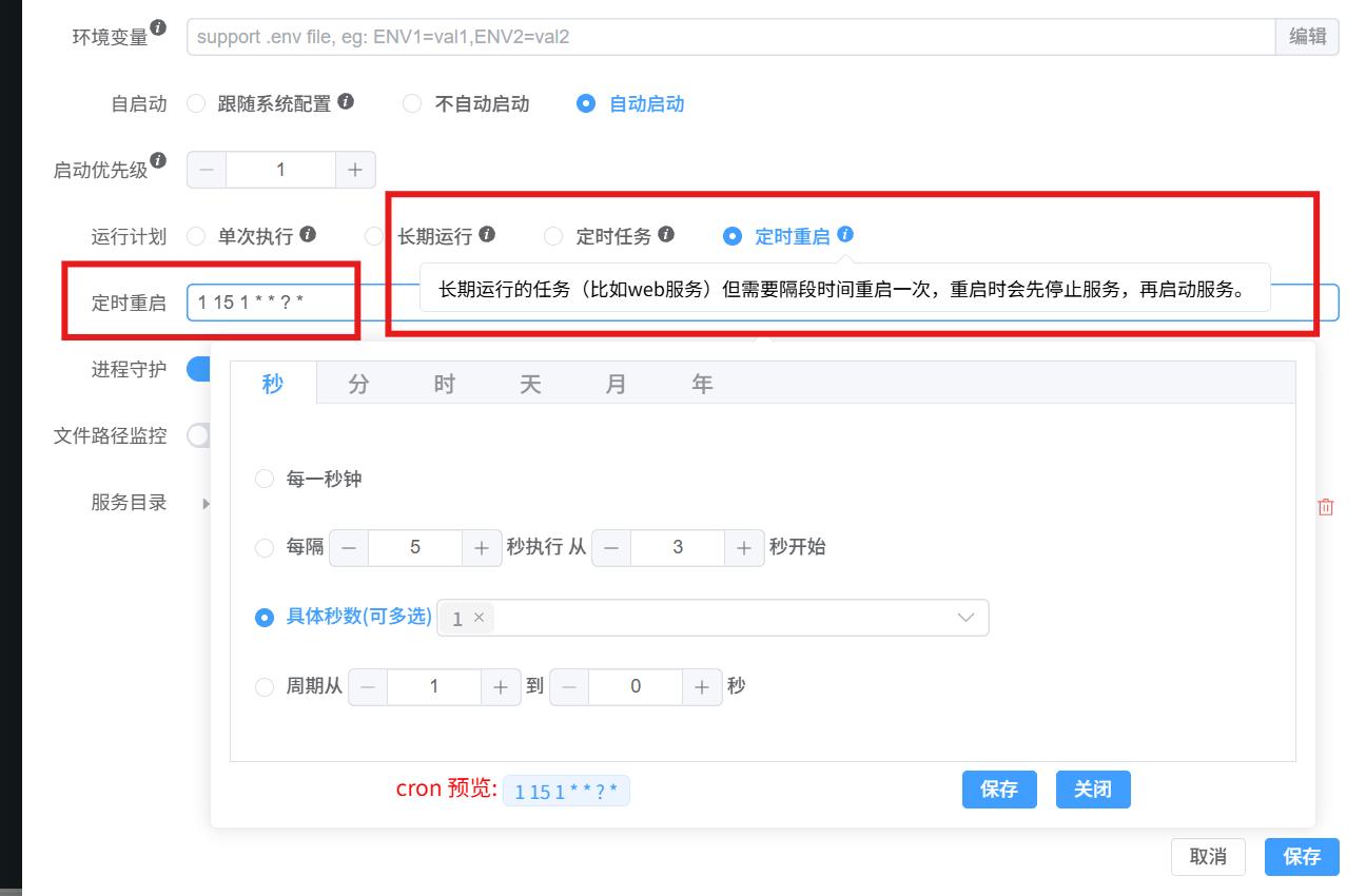 - 新增定时重启服务配置,可使用CRON表达式配置重启计划