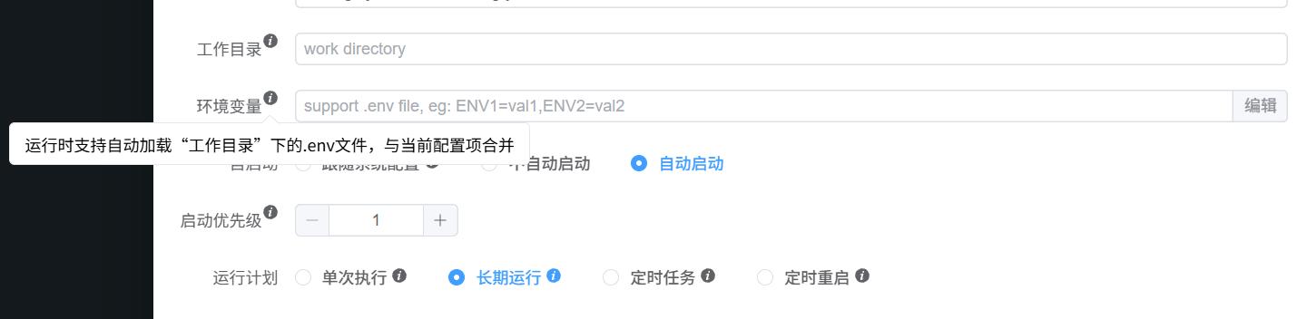 服务启动时会自动加载【工作目录】下的.env文件中配置的环境变量,并和服务配置中配置的环境变量合并。注意工作目录未配置时默认是服务目录,如果修改了工作目录只会加载工作目录中.env文件。