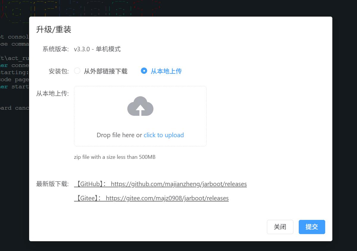 如下图,除了可以通过脚本来升级/重装外,也可以通过界面右上角的升级按钮来升级或重装,可以通过上次安装包文件或者输入下载链接地址让jarboot自己下载两种方式来升级或安装。效果与执行upgrade脚本一样。