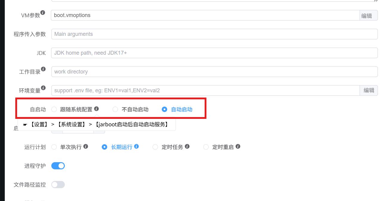 配置自启动可以让jarboot启动自身后自动启动该服务,默认配置是跟随系统配置,即【设置】/ 【系统配置】/ 【jarboot启动后自动启动服务】这个配置项,选择【自动启动】则无论系统配置如何都会自动启动。