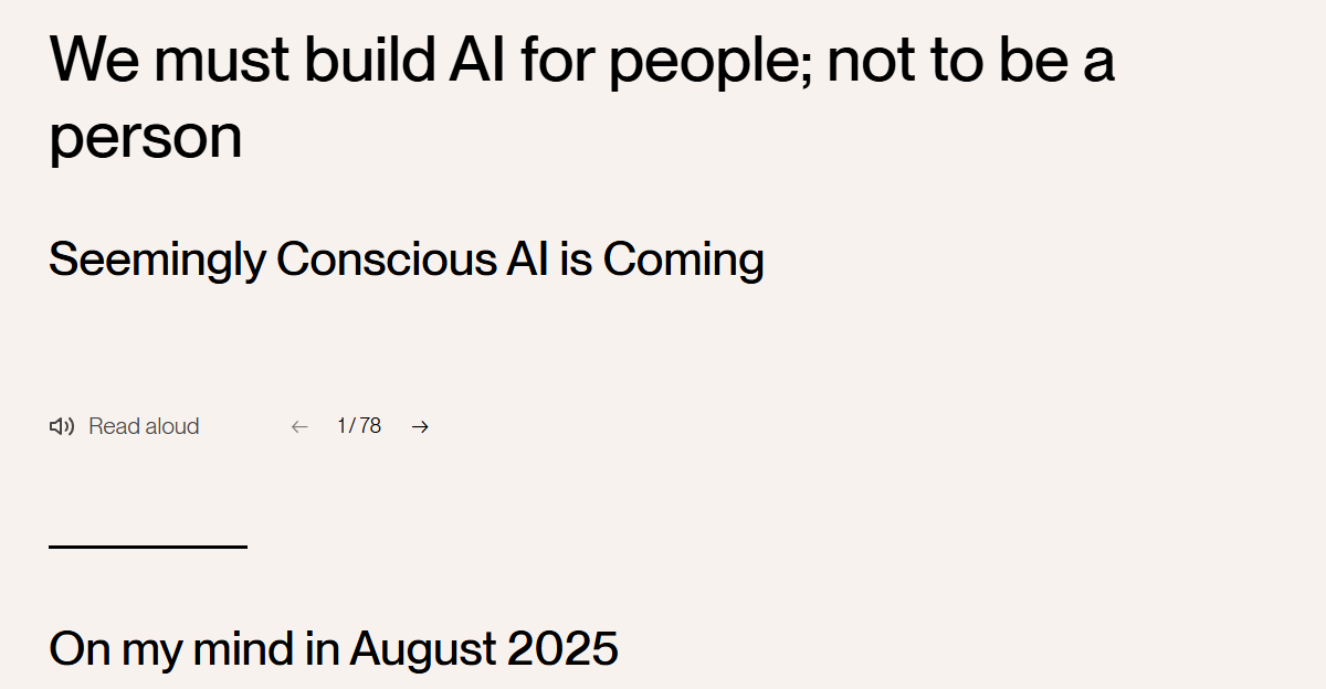 苏莱曼提醒,科技行业应该为人类打造人工智能,而不是把其转变为数字人。他呼吁立即建立保护措施,以确保这项技术能为人类带来益处,而不是造成伤害。他认为,人工智能公司不应声称或暗示其产品具有意识,这样的做法可能会引发更大的社会问题。