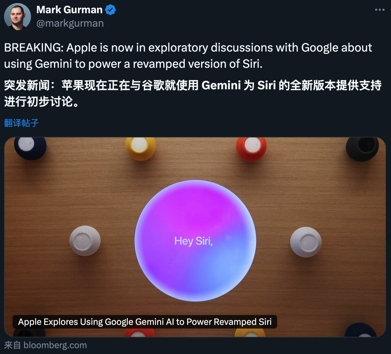 彭博社记者 Mark Gurman 报道称,苹果正在与谷歌开展早期讨论,考虑基于谷歌 Gemini 构建定制 AI 模型并在 Siri 中使用。苹果还在同步权衡各种选择,尚未确定是使用内部模型还是与第三方合作。