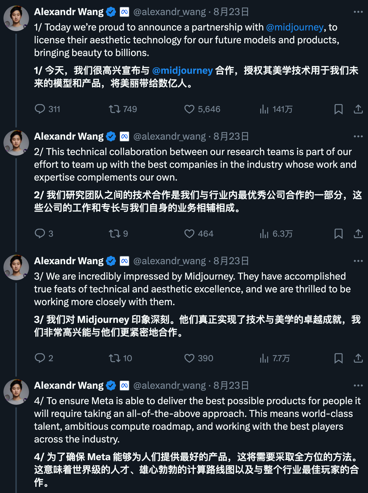 Meta 首席 AI 官 Alexandr Wang 宣布,Meta 已与 Midjourney 达成合作,将获得其美学技术 (Aesthetic Technology) 许可,将把 Midjourney 在图像与视频生成领域积累的美学技术整合到未来 Meta 的模型与产品中。