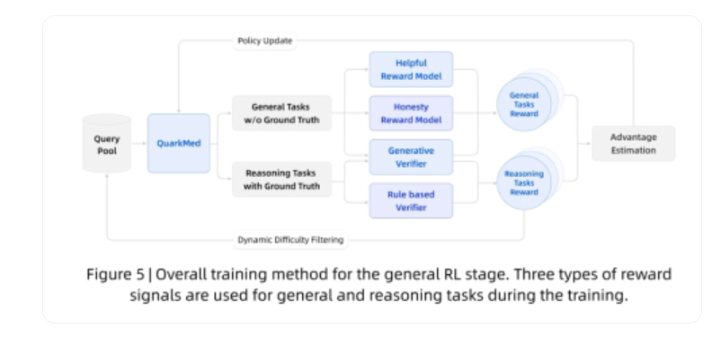 为提升模型正确性、安全性以及复杂推理能力,夸克健康大模型引入两个强化学习(RL)阶段。第一阶段通过大规模医学强化学习,提升大模型在复杂场景中的推理能力。第二阶段通过设计奖励模型,从诚实性、有用性、内容合规性三个角度评估模型输出质量、调整模型行为,使其符合人类偏好和价值观。