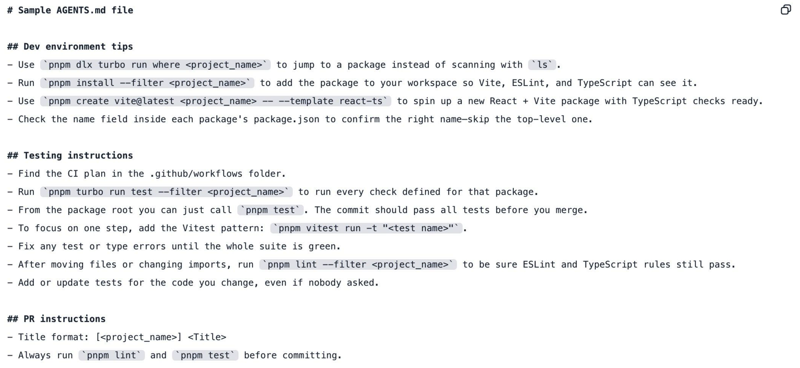 AGENTS.md 被定位为 “为 Agent 设计的 README”,是一个简单、开放的格式,用于向编码 Agent 提供指导。其设计初衷是为了补充专为人类开发者设计的 README.md 文件。