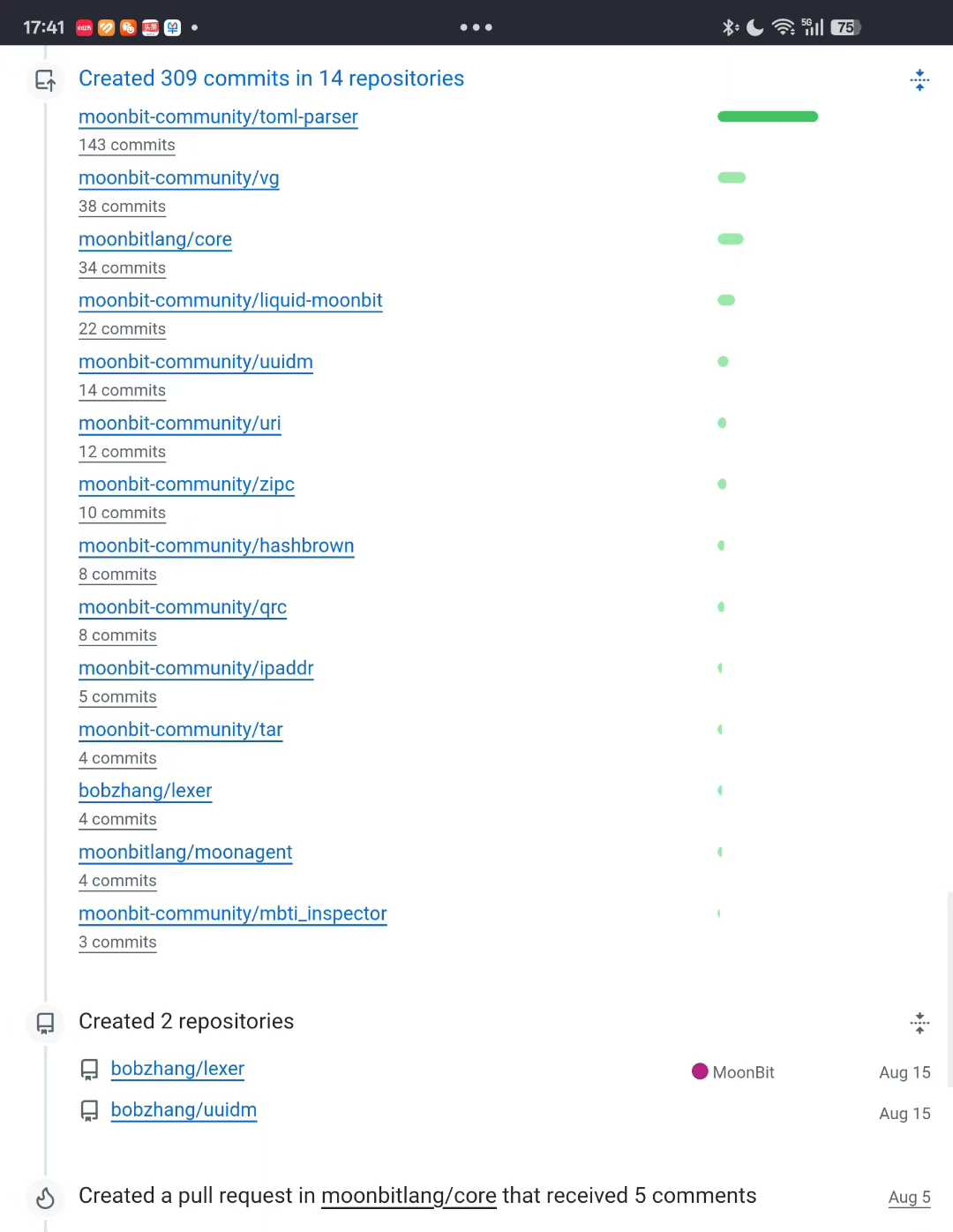 现在,张宏波用 MoonBit Pilot 等 AI 工具写 MoonBit。过去一周,他用闲暇时间写了 309 个高质量的 Commits,实现了相当于过去一个优秀程序员一年的工作量。