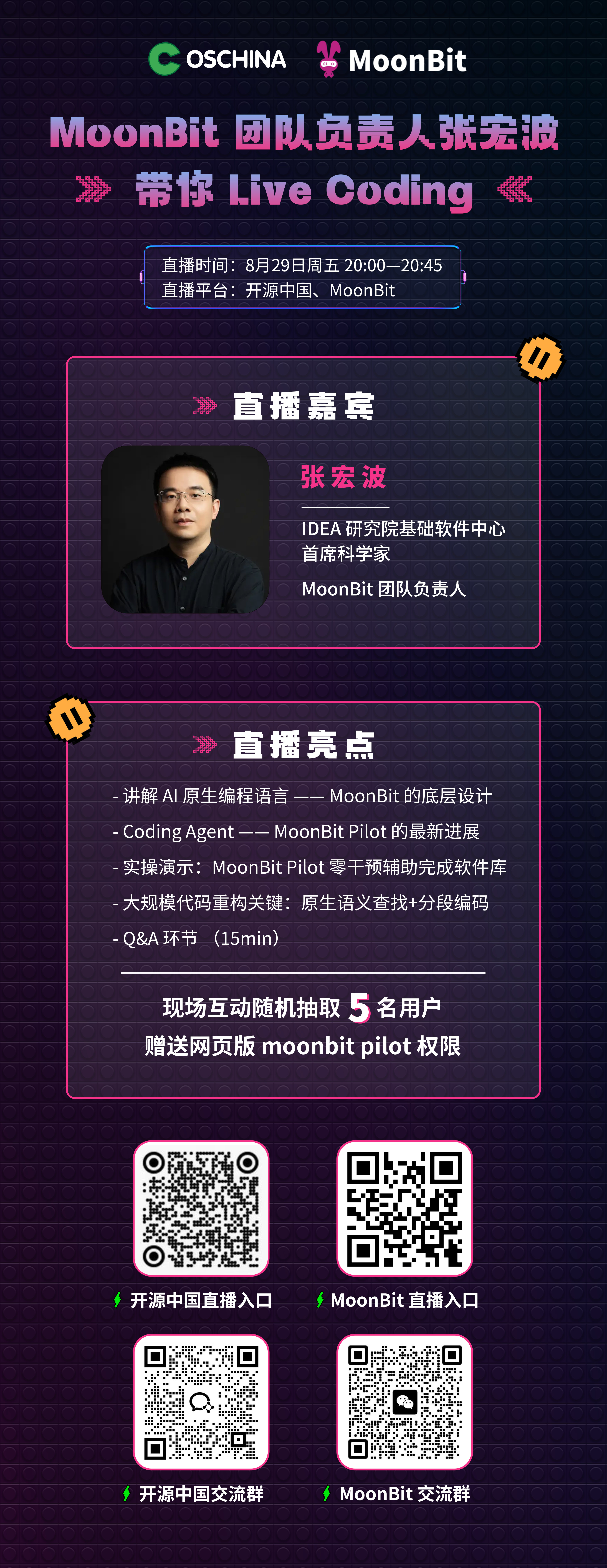 他是怎么做到的?8月29日晚,IDEA 研究院基础软件中心首席科学家、MoonBit 团队负责人张宏波,将做客开源中国《技术领航》栏目直播间: