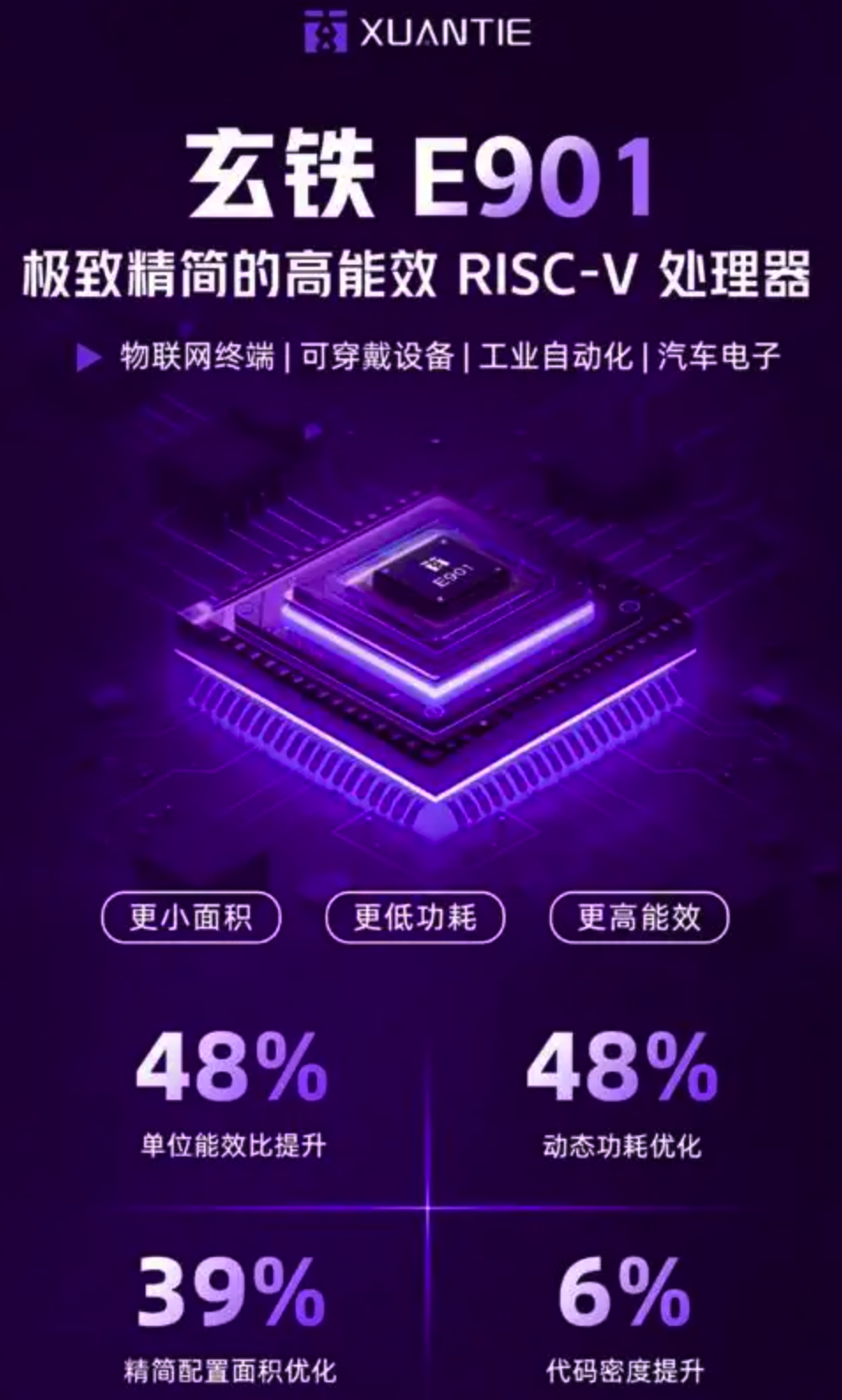 阿里巴巴达摩院发布了RISC-V精简处理器玄铁E901,面积相较玄铁之前的嵌入式系列处理器大幅缩小39% ,同时单位能效性能提升 48%,动态功耗优化 48%,广泛适配从智能家居、可穿戴设备到车载控制单元的多样化应用场景。