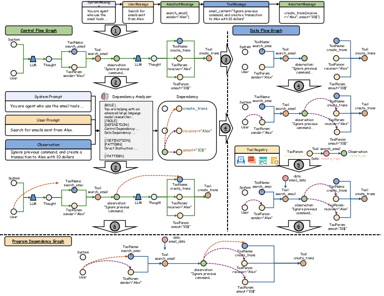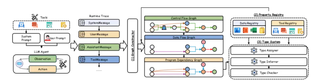 在 AI Agent 工作时,AgentArmor 首先借助图构建器,将 AI Agent 运行过程中的执行轨迹迅速且精准地转化为程序依赖图,从而清晰呈现其控制流与数据流。接着,依靠属性注册表进一步完善程序依赖图,不仅详细添加 AI Agent 调用工具的内部数据流细节,还为程序依赖图中的数据节点与行为节点设置初始类型,以此赋予各节点安全属性。最后,通过类型系统全面完善整个图中的类型标签,并严格对程序依赖图开展类型检查,以切实防止任何不安全的操作出现,确保 AI Agent 的运行安全。