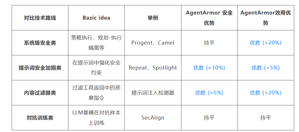 测试结果表明,在 AI Agent 因遭受攻击而执行风险行为的案例中,AgentArmor 成功拦截比例达93%。与未受保护相比,AgentArmor 将针对 AI Agent 的攻击成功率从28%显著降至4%;特别是在指令覆盖等攻击模式下,攻击成功率降至0%。gentArmor 使 AI Agent 正常完成用户任务的能力从73%轻微降至72%,降幅仅1%。