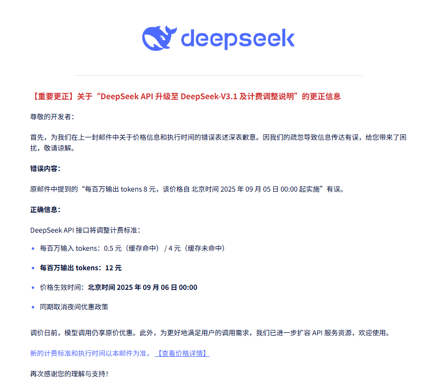 DeepSeek 向用户发送了错误的模型 API 费用信息邮件